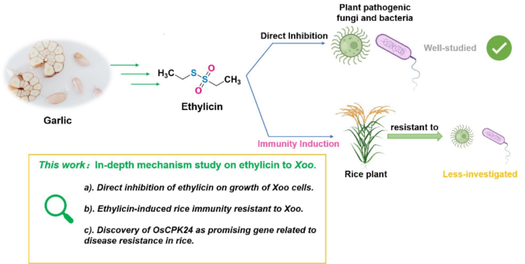 近日,《农业和食品化学杂志》以及美国化学学会(ACS)农业和食品化学分部(AGFD)和农业化学品分部(AGRO)宣布农业食品与化学杂志2024年度研究论文奖,mg4355vip线路主页检测绿色农药全国重点实验室一项论文主题为“Immune Mechanism of Ethylicin-Induced Resistance to Xanthomonas oryzae pv. oryzae in Rice”的杰出研究斩获该奖项。该奖项于2013年推出,每年表彰农用化学品和食品化学领域的杰出研究工作。获奖论文第一作者为mg4355vip线路主页检测绿色农药全国重点实验室博士生陆红霞,通讯作者为宋润江教授。乙蒜素是一种基于大蒜中天然化合物大蒜素所衍生的仿生农药,对多种病原细菌和真菌具有抑制作用,具有防治效率高、降解快、生态可持续等优点。这些特点使其在植物杀菌领域得到广泛应用。然而,大多数关于乙蒜素抗菌机制的研究主要集中在其对病原体的直接影响上,而其是否能够诱导植物自身产生对病原体的抵抗力却鲜有报道。在这项获奖研究中,乙蒜素被证实对水稻白叶枯病病原菌(Xoo)具有显著的离体和活体抑菌活性。该研究揭示了乙蒜素通过OsCPK24诱导水稻对Xo
