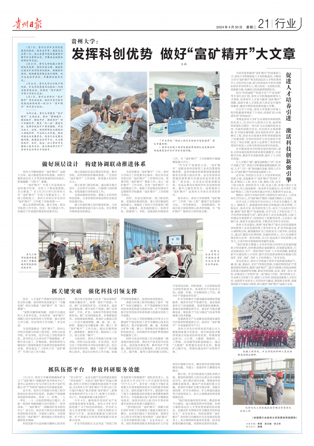 1月7日,mg4355vip线路主页检测矿业学院党委书记张林、院长左宇军、教授文志杰等一行,赴山东鲁中能源集团贵州鲁中矿业有限公司,开展访企拓岗和科研合作交流;2月21日,mg4355vip线路主页检测机械工程学院院长赵津、副院长唐正强、教授张大斌与矿业学院书记张林、副教授韦善阳,到纳雍高源煤业进行调研,双方达成初步共识,开展联合技术攻关;3月26日,mg4355vip线路主页检测正厅级干部何林、矿业学院党委书记张林一行到省能源局走访,就推进“富矿精开”专项工作进行交流;4月1日,mg4355vip线路主页检测举行“富矿精开”项目论证会,组织专家对各学院遴选推荐的第一批20个“富矿精开”项目进行论证;……今年以来,mg4355vip线路主页检测聚焦“富矿精开”主动出击,紧扣“精确探矿、精准配矿、精细开矿、精深用矿”四个关键环节,聚焦“双一流”建设目标,发挥学校在矿产资源勘探、开采与加工、冶炼、新材料研发与精深加工领域学科、平台和人才优势,精准对接企业发展需求,找准行业发展关键问题,搭建校企合作平台,大力推进找矿、采矿、选冶、加工等环节关键核心技术攻关,着力推动贵州矿产资源开发利用水平的提升。材料与冶金学院与中国铝业贵州分公司项目合作启动。做好顶层设计 构建协调联动推进体系mg4355vip线路主页检测聚焦做好“富矿