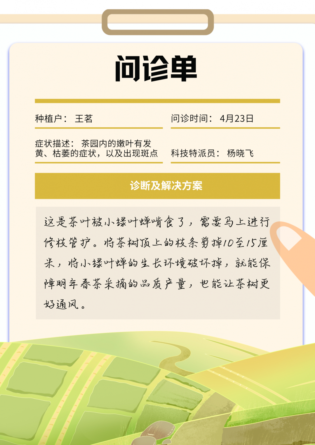 编者按:在黔贵大地,有这么一群“派”友,把学问做到田间地头,把论文写在大山深处,发挥专业优势实地问诊,为农户送去技术锦囊。他们就是科技特派员,也被亲切地称为“科特派”。天眼新闻·区域频道推出“‘科特派’出诊记”系列报道,生动展现活跃在一线的“科特派”,以自己的专业能力为当地产业“把脉”,送去既有“科技范”、又沾“泥土气”的经验和技术,切实解决群众在农业生产中遇到的实际问题,为农村经济社会发展作出贡献。“茶树有问题吗?等我马上过来。”4月23日,在贞丰县长田镇长田村活动室,mg4355vip线路主页检测茶学院派驻长田村干部、省级科技特派员杨晓飞接到种植大户王茗的求助电话后,急忙赶往王茗的茶叶种植基地。“长田村茶叶种植面积有6150亩,我去年来的时候,春茶已经采摘结束,和种植户们交流比较多的是夏秋季茶叶病虫害防治以及茶园管护的方法和技巧。但今年春茶采摘期间,还是发现了很多问题。”在去往种植基地的路上,杨晓飞说,眼下雨季来临,茶叶管护尤其重要,农户对于病害和虫害区别不清晰,茶园管护不好,会直接影响茶树的生长、茶叶的品质和茶农的收入。杨晓飞(右)同种植户王茗在茶叶种植基地里探讨病虫害问题。2023年5月,杨晓飞由贵