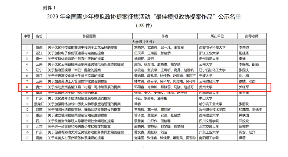 贵大学生团队作品获全国“最佳模拟政协提案作品”。共青团mg4355vip线路主页检测团委供图近日,2023年全国青少年模拟政协提案征集活动评审结果出炉,mg4355vip线路主页检测学生团队作品《关于推动贵州省榕江县“村超”可持续发展的提案》获“最佳模拟政协提案作品”。2023年,榕江“村超”火爆出圈。极具“烟火气”的乡村体育赛事,点燃了夏日欢乐气氛,打响了贵州文旅战,促进文化、体育、旅游等产业综合发展。如何在快流量时代延续“村超”热点是该团队最关心的问题。“从校赛、省赛到国赛,团队成员配合默契,不断打磨作品,始终保持着真诚、乐观面对每一次挑战。”谈及选择贵州“村超”作为提案选题的原因,团队负责人工商管理专业2022级学生邓雨容表示,“作为土生土长的贵州人,我深感肩负着助力家乡建设发展的重任。我们将继续关注乡村振兴领域,不断积累知识和技能,为乡村振兴贡献智慧和力量。”团队通过专题座谈、问卷调查和深度访谈等形式,深入榕江县进行实地调研,为“村超”提出加大地方政府政策支持力度,推动“村超”规范性发展;推动体育文旅IP产业化,吸引民间资本融资赋能;赓续“村超”文化火种,传承榕江足球精神等实用建议。“我被榕江独特的自然风光、米粉与烙锅编