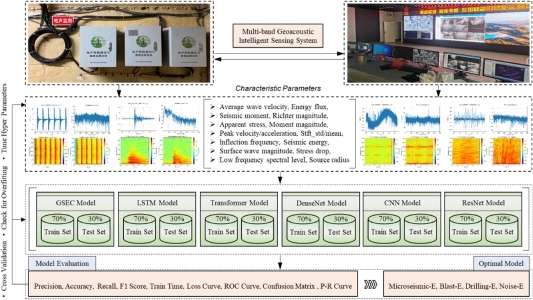贵大新闻网讯(矿业学院)近期,mg4355vip线路主页检测矿业学院左宇军教授领衔的矿山动力灾害预警与控制团队在矿山微震信号识别及处理技术领域取得重要研究成果。相关成果发表在国际顶级期刊 International Journal of Rock Mechanics and Mining Engineering (IF=7.0,中科院一区TOP期刊)和 Engineering Geology (IF=6.9,中科院一区TOP期刊)。论文第一单位为mg4355vip线路主页检测,mg4355vip线路主页检测矿业学院左宇军教授及省外高水平大学“组团式”帮扶专家、中南大学董陇军教授为论文通讯作者,王剑博士后为论文第一作者。微震活动是地下采矿环境中应力重分布、地质异常和潜在风险的关键指标。如何快速有效地识别微震事件,例如噪音、爆炸和钻孔活动,对于确定矿山的稳定性和安全性至关重要。研究成果系统开展了矿山微震信号识别及处理技术方面的研究,构建了K-means和高斯混合模型(GMM)相结合的聚类方法,对矿区微震信号进行时空聚类分析,确定了导致微地震事件的采矿相关活动,例如地应力重分布、矿石运输、爆破和钻孔;采用短时傅里叶变换(STFT)提取的频率平均值和标准差、