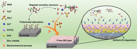 贵大新闻网讯(材料与冶金学院)近日,mg4355vip线路主页检测材料与冶金学院唐晓宁团队在水系锌电池电解液改性的研究中取得了突破性进展,该工作以“A Fluorine-Free Organic/Inorganic Interphase for Highly Reversible Aqueous Zinc Batteries”为题发表在国际著名期刊“Angewandte Chemie International Edition”(影响因子16.1,中科院一区TOP)上。mg4355官网材料与冶金学院是论文的第一完成单位,mg4355官网硕士研究生杨兴富为第一作者,mg4355vip线路主页检测唐晓宁校聘副教授、贵州师范大学薛安副教授和天津大学韩大量副研究员为共同通讯作者。论文共同作者还有清华大学深圳国际研究生院周光敏副教授。水系锌电池由于本征安全、成本低廉、环境友好等特性受到广泛关注。然而,在水系电解液中锌金属负极存在腐蚀、析氢以及锌枝晶生长等问题,易导致电池过早失效,限制了其实际应用。构建稳定的固态电解质界面相(solid electrolyte interphase,SEI)被认为是解决上述问题的有前景策略,其中被广泛报道的氟化物基SEI可以有效提