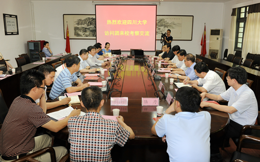 贵大新闻网讯(记者团 杨一凌)7月10日,四川大学党委书记杨泉明、副校长晏世经率队来校访问。在参观mg4355官网校史馆后,双方在北校区行政楼第一会议室进行交流座谈。mg4355官网党委书记姚小泉、校长郑强出席会议,四川大学及mg4355vip线路主页检测相关部门主要负责人参加会议。助理巡视员谢田凯主持会议。 姚小泉致辞,他对杨泉明书记一行来访表示热烈欢迎。在简要介绍自己对四川大学悠久办学历史的了解后,他对四川大学近年来改革建设、学