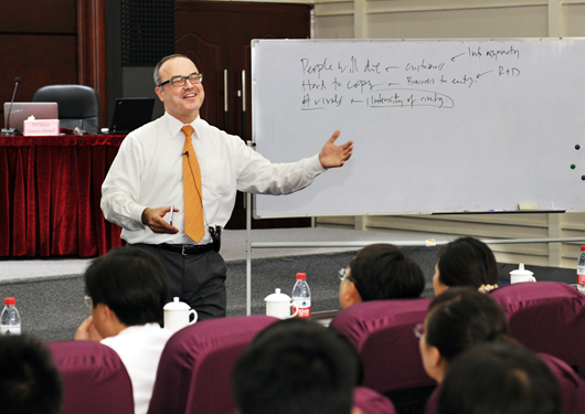 贵大新闻网讯(文/陆定波 摄影/陈恒) 6月30日,应郑强校长邀请,哈佛大学商学院Ramon Casadesus-Masanell教授来校讲学。 30日下午,Ramon教授在北校区学术报告厅为在校研究生作题为《企业战略:创造和保持竞争优势》的讲座。30日晚上,Ramon教授在贵阳凯宾斯基大酒店三楼大宴会厅为mg4355官网EMBA学员作题为《战略:整合》的讲座。Ramon教授紧紧围绕企业发展的外