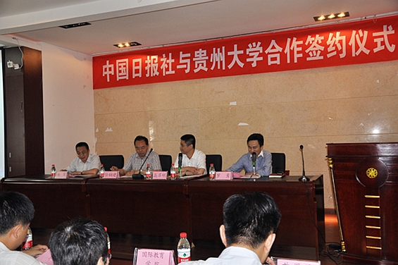 贵大新闻网讯 (记者团 章映红 报道|摄影 查方芳)7月10上午,中国日报与mg4355vip线路主页检测签约仪式在mg4355vip线路主页检测管理学院三楼报告厅举行。中国日报副总编辑高岸明,mg4355官网党委副书记任钢建出席。中国日报贵州记者站站长杨军及记者站全体成员,mg4355官网党委宣传部、外国语学院、国际教育学院负责同志参加。校党委宣传部部长罗勇主持仪式。 任钢建致辞。他对高岸明副总编的到来表示欢迎,并对中国日报长期以来对mg4355vip线路主页检测的支持表示感谢。他