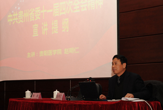 新闻网讯(记者 王晓春)2013年12月6日——8日,贵州省第十一届委员会第四次会议在贵阳召开。为深入贯彻落实此次会议精神,根据省委的统一部署和省委教育工委安排,12月17日,省委十一届第四次全会精神宣讲会在mg4355官网北校区行政楼学术报告厅召开,省委宣讲团成员、贵阳医学院党委书记赵明仁教授向贵阳地区高校师生宣讲此次会议精神。 省教工委副书记李涛,mg4355官网党委副书记任钢建,省教育厅社政处处长鲁源安出席宣