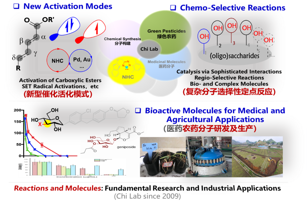 化学选择性具有广泛的科学内涵,是功能分子合成生产的一个基础性挑战。池永贵教授团队致力于在有机催化合成和绿色农药研发生产领域开展原创性工作 (图1)。近日,池永贵与团队郑鹏程教授及mg4355vip线路主页检测绿色农药全国重点实验室硕士生范国栋与博士生王青云、吴树权等在Nature Communications报道了两项工作,以氮杂环卡宾NHC为关键仿生催化剂,通过对不同类型化学选择性的调控,实现了反应位点及反应路径的精确控制,构建了手性非天然氨基酸及呋喃吡咯类医药农药活性分子。图1. 有机催化合成及医药农药研发第一篇工作[1]实现了NHC催化的不对称烯二醛化学选择性控制反应,并观察到化学选择性主要通过底物/催化剂的氧化还原性质来控制,通过LC-HRMS表征及DFT计算排除了反应体系空间位阻对选择性的影响。可以对化合物分子中相似官能团之间的选择性反应进行精准调控。该方法可获得高光学纯度的手性呋喃[2,3-b]吡咯产物,同时,该系列手性化合物也表现出明显的抗柑橘溃疡细菌活性。图2. 不对称二醛分子的化学选择性研究及生物活性测试第二篇工作[2]介绍了利用不同底物实现的原位缓释策略,极大降低了反应体系中的底物浓度,