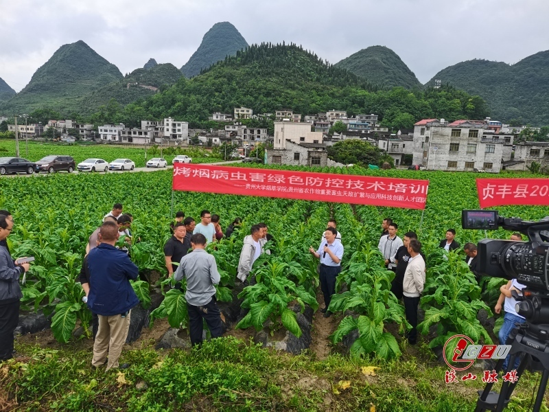 时下正值烤烟生长田间管理关键时期,做好病虫害防治将十分有益于田间中颗烟的长成,是“促增收、提质量”的有效手段。6月5日上午,mg4355vip线路主页检测烟草学院院长杨茂发教授带领学院植保和栽培两个团队一行10人,到mg4355vip线路主页检测对口帮扶的黔西南州贞丰县开展烟田管理技术培训,贞丰县烟草专卖局(分公司)局长谢培荣、副经理史广强及四十余名生产技术人员和烟农代表参加了现场培训会。此次培训内容包括“烤烟病虫害绿色防控”和“烤烟中后期田间管理”两个方面,目的是将烤烟绿色管护技术送至田间地头,助力贞丰县的烤烟生产。在纳山村烟地里,学院三位老师结合烟田实际,分别从烤烟虫害、病害及中后期田间管理方面进行了系统讲解。杨茂发教授就田间识别烤烟“三虫”与虫害绿色防控展开培训,主要向烟农及技术员介绍了烤烟的主要害虫种类、为害特点、发生规律及绿色防控的具体措施,还对我院与遵义市烟草公司共同开发的优效天敌昆虫产品——食蚜瘿蚊的田间释放技术进行了现场示范。桑维钧教授重点讲解了烤烟“三病”,同时就烟地里出现的病害详细地介绍了病因、田间症状以及绿色防治措施。高焕晔副教授就本年度烤烟种植中后期的田间管理技术展开培训,给烟农讲解了田间管理的“促”与“