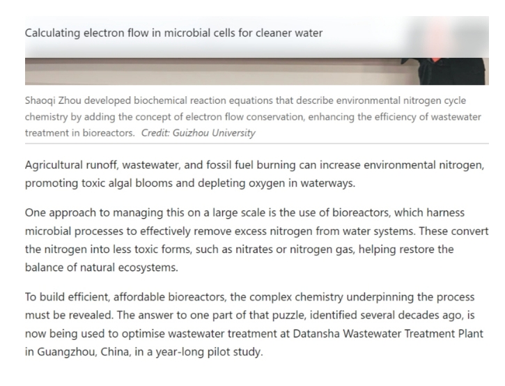 近日,国际顶级学术刊物《自然》(Nature)杂志在线连发两篇专访文章,专题报道国际欧亚科学院院士、环境生命科学专家、mg4355vip线路主页检测周少奇教授团队的原创科研成果。第一篇专访文章题目为“REDUCING ALGAL BLOOMS WITH BIOCHEMICAL REACTIONS”(生化反应之功,守护碧水清波),介绍了周少奇教授二十多年来深入研究生物化学反应,探讨碳氮磷协同生物减排理论与技术以控制水体富营养化的奋斗历程。文章提到,周少奇教授“开创性地提出了更加精准分析氮、磷和COD同步去除过程的化学计量方程和计量比模型(COD/N/P),详细描述了所谓的反硝化除磷菌(DPB)如何去除营养物质。这一成果基于他在‘电子计量学’领域的开创性研究。这种原创方法通过在化学计量方程研究中分析分子间的电子迁移来精准描述化学反应”。文章同时提到,周少奇教授带领团队发现四种新型反硝化除磷菌(可交替以分子氧、亚硝酸根、硝酸根为电子受体实现聚磷)并开发出创新的生物处理工艺与装备,成功应用于城市污水与农村污水处理工程,实现工程化与产业化应用,具有广阔的推广应用前景。第二篇专访文章标题为“CALCULATING EL