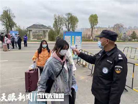 安保人员正在对返校学生进行体温测量