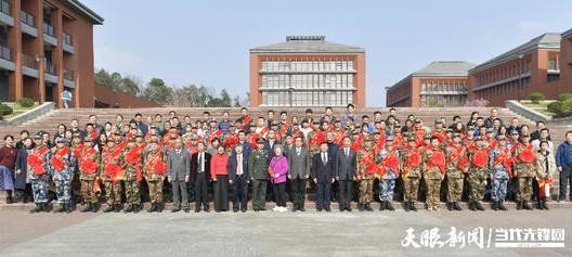 欢送仪式上,mg4355vip线路主页检测校领导和嘉宾为入伍大学生代表佩戴光荣花,并为入伍学生代表颁发“书记校长特别嘉奖·应征入伍奖学金”,为入伍毕业生代表颁发“毕业证书”。