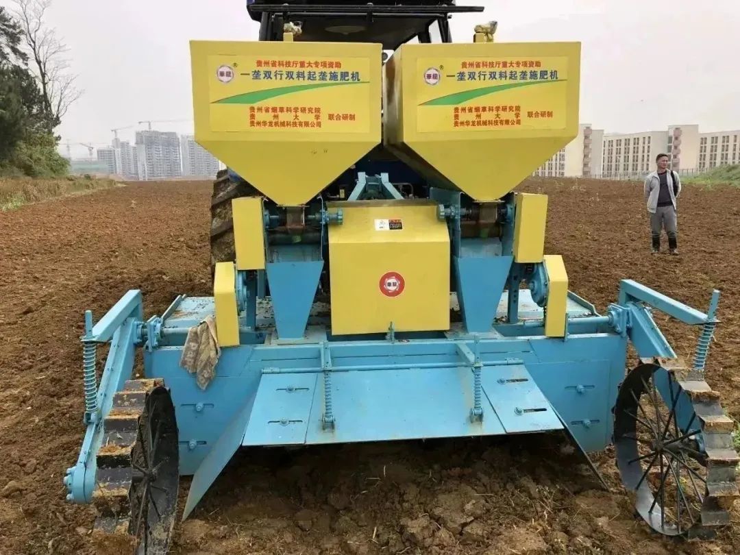 该机与40马力拖拉机配套,以有机肥、复合肥为施肥对象,同时一次性完成两种肥料的田间条施和起垄,实现一垄单行起垄施肥功能。(图片为80马力驱动的双料箱一垄双行施肥起垄机,单行较小,更加适合贵州)