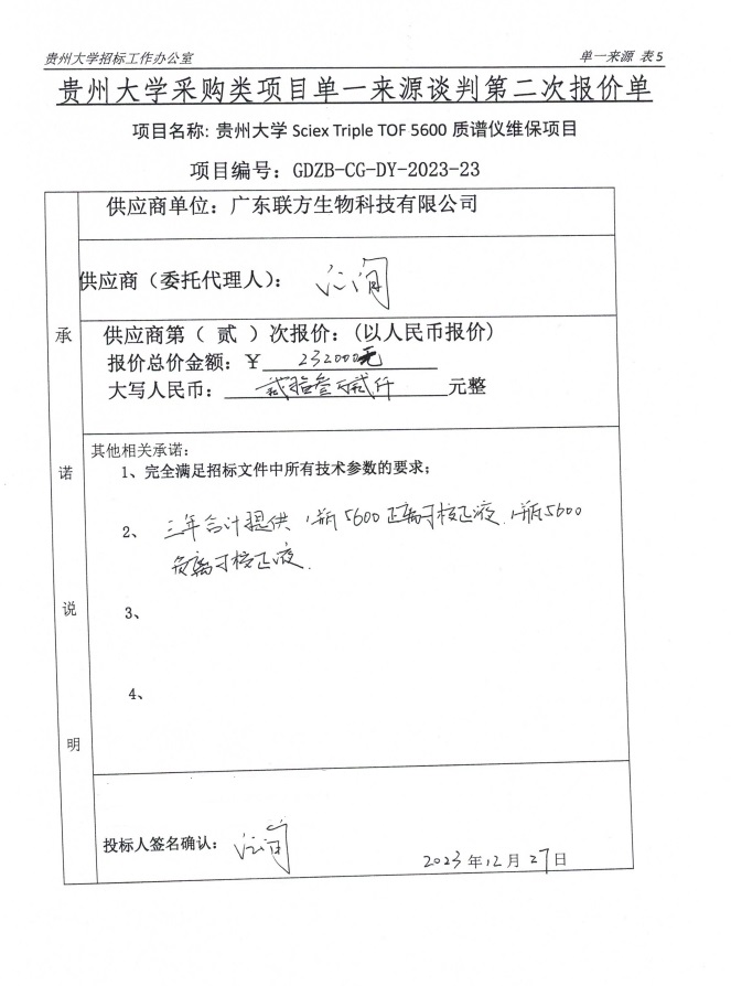 1 | 广东联方生物科技有限公司 | 广州市番禺区南村镇江南工业二区一横路1号H栋406、405、404 | mg4355vip线路主页检测Sciex Triple TOF 5600质谱仪维保项目,详见《单一来源采购谈判文件》 | ¥232000.00 |
