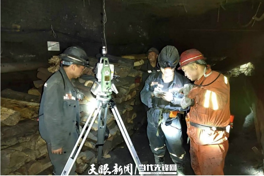 兰红(右一)在矿区与一线班组开展闭合测量验证施工准确度