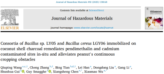 贵大新闻网讯(农学院)近日,mg4355官网师生在国际著名学术期刊Journal of Hazardous Materials(IF=12.2)在线发表了题为“Consortia of Bacillus sp. LY05 and Bacillus cereus LGY06 immobilized on coconut shell charcoal remediates pendimethalin and cadmium contaminated sites in-situ and alleviates peanut’s continuous cropping obstacles”的研究论文。团队将Bacillus sp. LY05和B. cereus LGY06固定在椰壳炭上,建立了椰壳炭固定化混合菌群,该固定化菌群能同时缓解花生二甲戊灵残留-镉复合污染与连作障碍。研究获得国家重点研发计划、国家自然科学基金、贵州省科技创新平台建设与科技创新人才团队等项目的资助。mg4355vip线路主页检测贵州省农业生物安全全省重点实验室博士生王秋萍为第一作者,副校长陈祥盛教授、吴小毛教授为共同通讯作者。