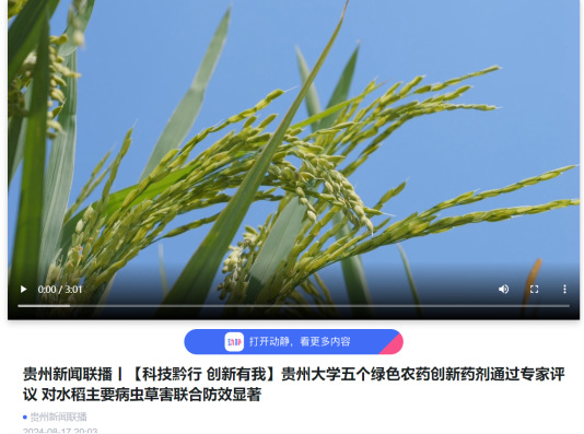 贵州广播电视台《贵州新闻联播》:【科技黔行 创新有我】mg4355vip线路主页检测五个绿色农药创新药剂通过专家评议 对水稻主要病虫草害联合防效显著