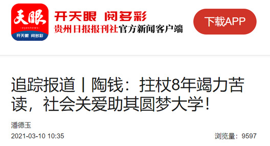 天眼(贵州日报当代融媒体集团新闻客户端):追踪报道丨陶钱:拄杖8年竭力苦读,社会关爱助其圆梦大学!