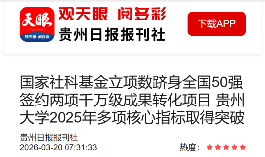 天眼新闻客户端:国家社科基金立项数跻身全国50强 签约两项千万级成果转化项目 mg4355vip线路主页检测2025年多项核心指标取得突破